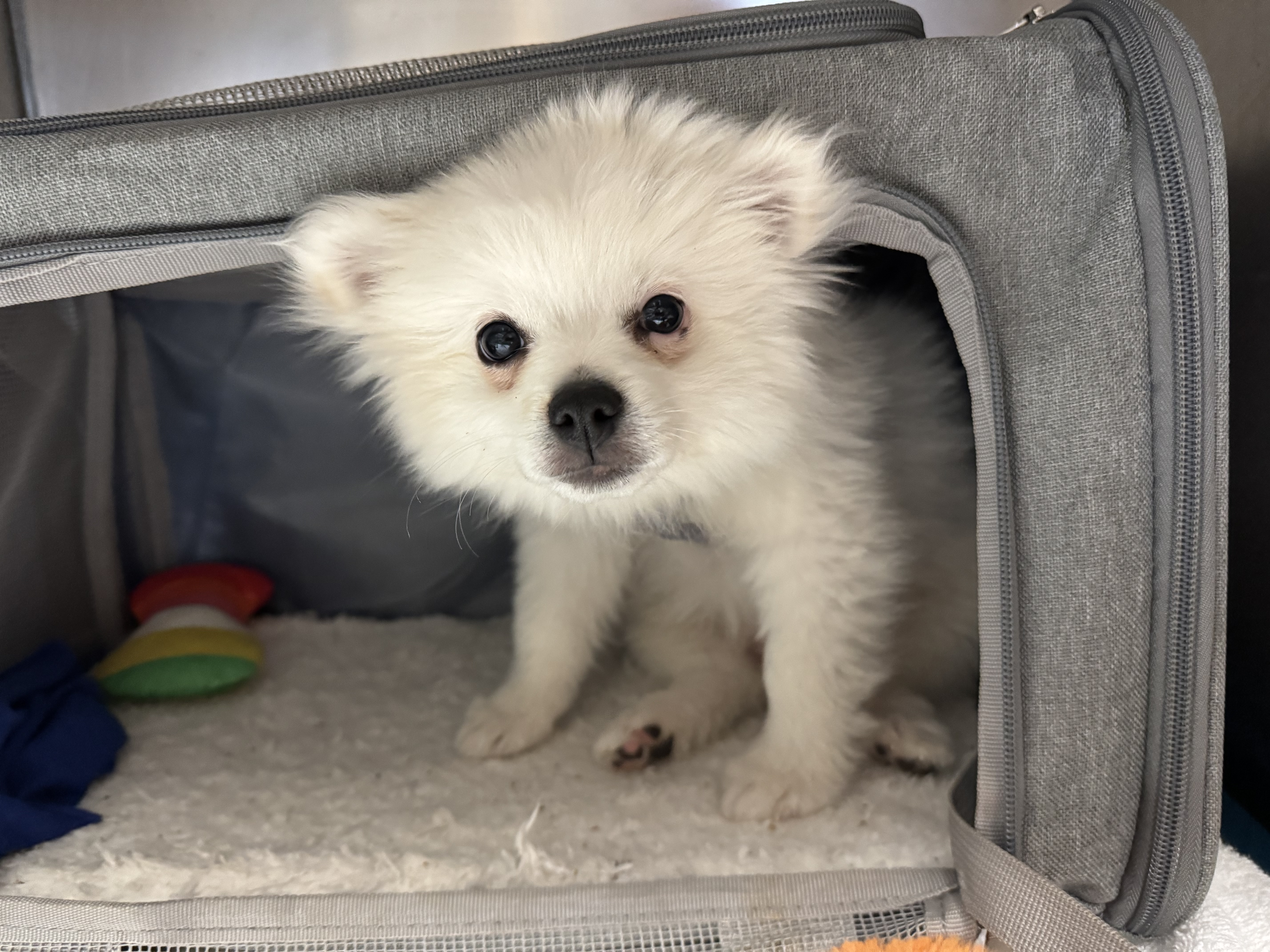 Is that a polar bear cub?! No, just a sweet Pomsky poking her head out to say hi.